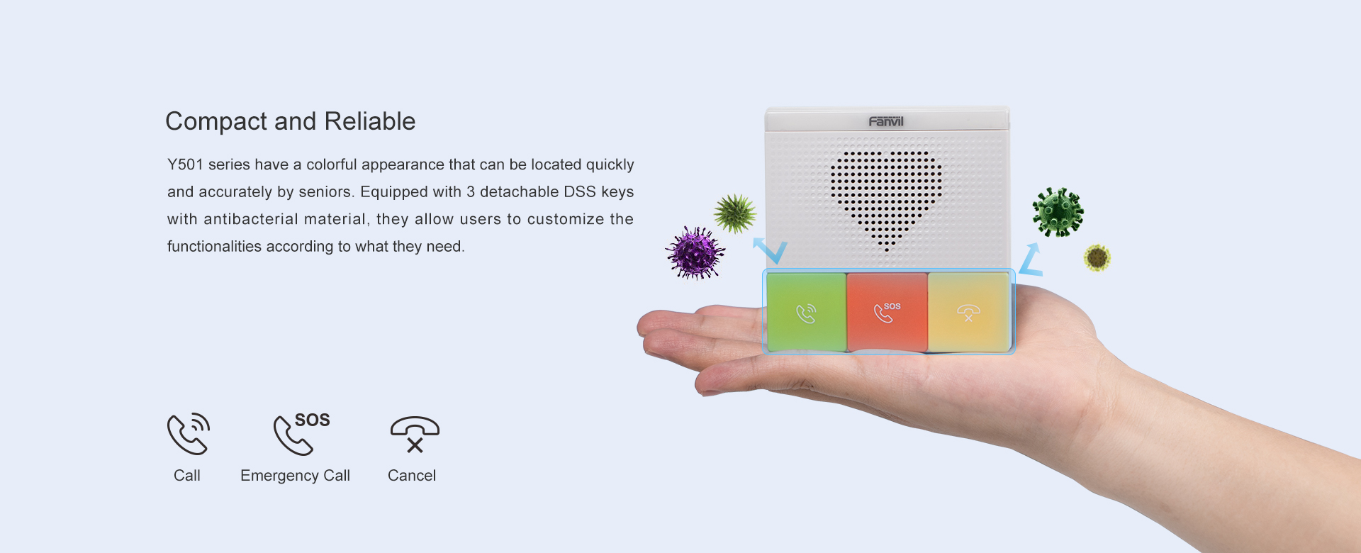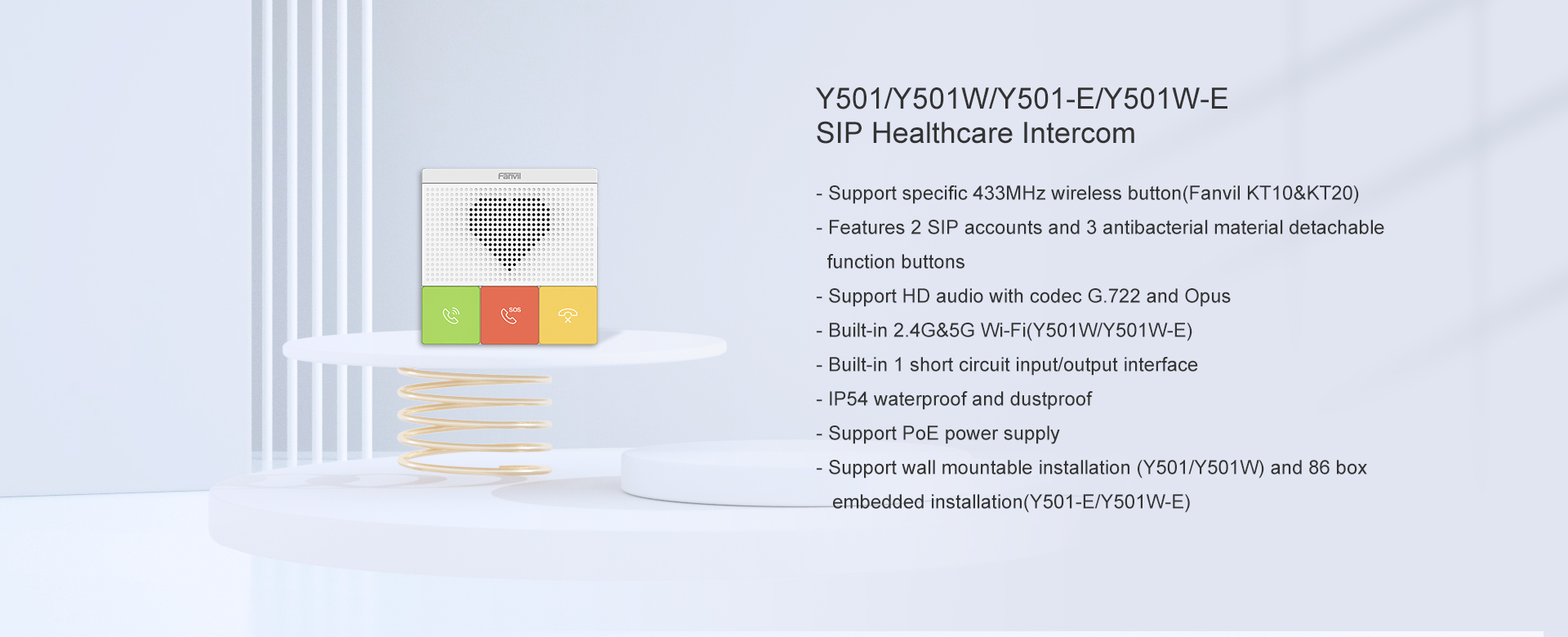 Los intercomunicadores SIP para el cuidado de la salud de la serie Fanvil Y501 están especialmente diseñados para la atención domiciliaria, la residencia de ancianos y otras aplicaciones en interiores, realizando la comunicación de emergencia, la protección de seguridad, la transmisión, etc. Cuentan con audio HD, 2 cuentas SIP, teclas DSS desmontables, IP54 resistente al agua y al polvo, y Wi-Fi 2.4G y 5G incorporado (Y501W / Y501W-E). La serie Y501 proporciona diferentes modos de instalación de caja estándar 86 integrada y montable en la pared, lo que le brinda una experiencia de comunicación de atención médica oportuna.