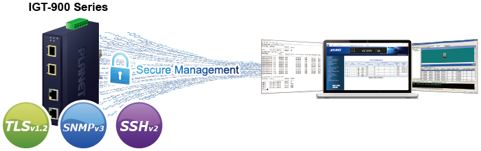La serie IGT-900 viene con ciberseguridad mejorada para defenderse de las ciber amenazas y los ciberataques. Admite los protocolos SSHv2, TLSv1.2 y SNMPv3 para brindar una protección sólida contra amenazas avanzadas. La función de ciberseguridad de la serie IGT-900, que funciona como un punto clave para transmitir datos a los equipos críticos del cliente en una red empresarial, protege la administración y mejora la seguridad de la red de misión crítica sin ningún costo ni esfuerzo de implementación adicional.