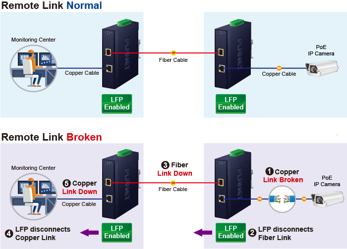 El IGT-900-1T1S proporciona MDI/MDI-X automático en su puerto TP y función Link Fault Pass-through (LFP) integrada. La función LFP incluye Link Loss Carry Forward (LLCF) y Link Loss Return (LLR), las cuales pueden alertar inmediatamente a los administradores sobre el problema del medio de enlace y proporcionar una solución eficiente para monitorear la red.