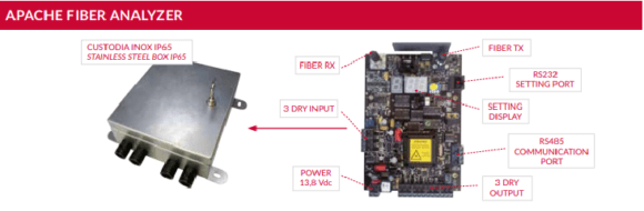 El elemento sensor es la fibra óptica atravesada por un haz de luz. Este último sufre cambios directamente relacionados con los cambios físicos inducidos en la fibra durante los intentos de intrusión. El microprocesador analiza las variaciones en la señal generada por la diferencia entre el haz de luz enviado y recibido, a través de algoritmos especiales capaces de discriminar eventos naturales como viento, lluvia, granizo de intentos de intrusión reales. Además, a través de la simulación de los eventos que desea rastrear, puede, después de la instalación y en condiciones reales de trabajo, optimizar los parámetros de detección para reducir drásticamente la tasa de falsas alarmas. Cada analizador de fibra apache es capaz de