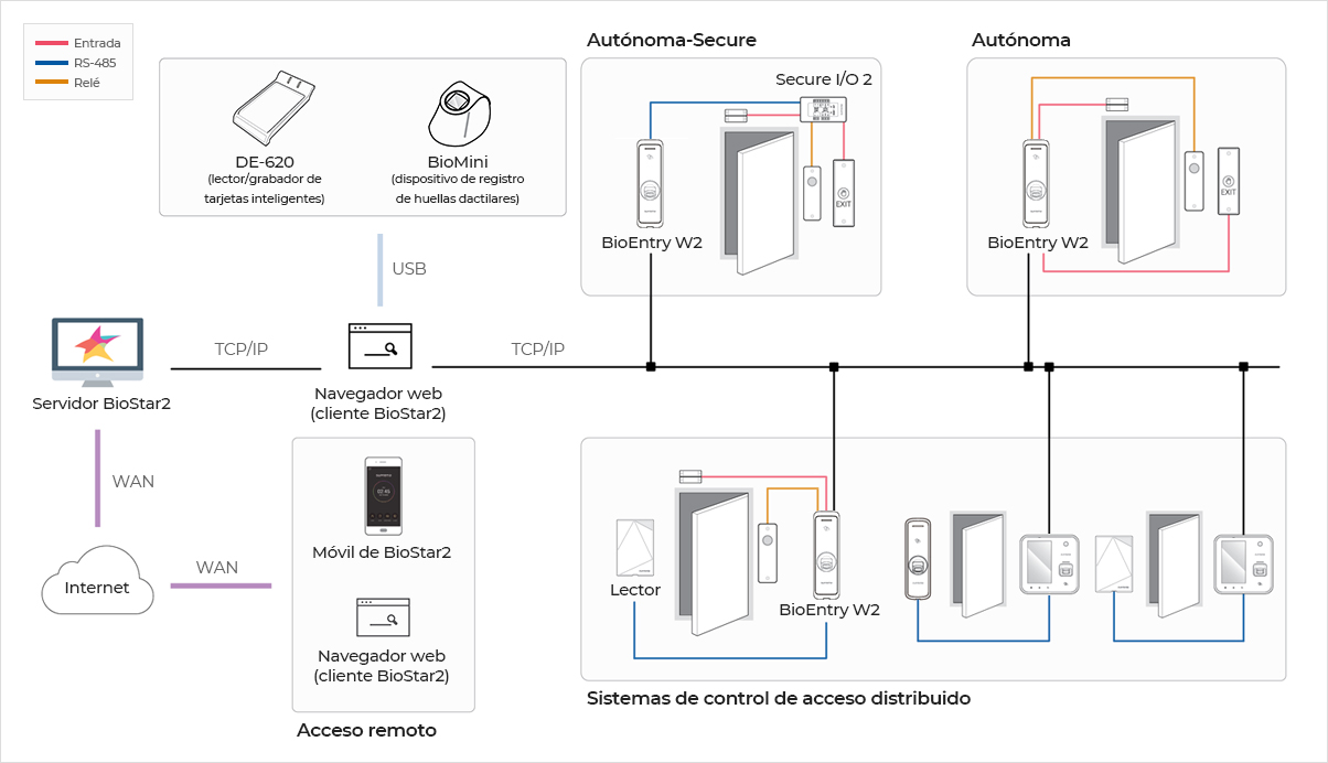 BioEntry W2 no solo viene con una interfaz TCP/IP, sino también con más interfaces tradicionales (RS-485, Wiegand) para proporcionar mayor flexibilidad y múltiples opciones de instalación para diferentes entornos. También ofrece 2 entradas internas y 1 salida de relé interna para el control de dispositivos periféricos. Los puertos de E/S pueden expandirse con el accesorio Secure I/O.