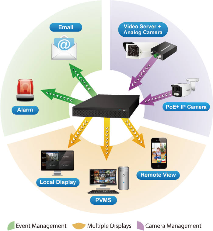 El NVR-2516P proporciona capacidad de gestión de vigilancia central con la adopción de su software de gestión de vídeo PLANET incluido. Con el PVMS, el sistema NVR-2516P NVR se puede ampliar para la gestión multisitio de hasta 256 canales de cámaras IP simultáneamente. Además, los usuarios pueden monitorear el NVR a través del visor de aplicaciones móviles o el navegador web en cualquier momento y en cualquier lugar.