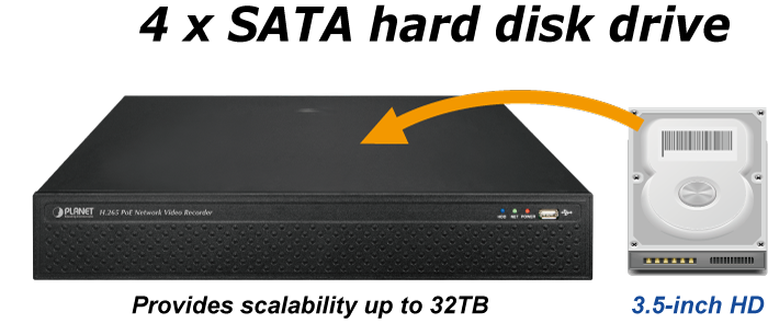 El NVR-2516P se puede utilizar como centro de control para controlar y supervisar hasta 25 cámaras de red conectadas (compatibles con ONVIF) de forma local o remota. Está perfectamente diseñado para el sistema de vigilancia IP inteligente, y con cuatro cajones de discos duros SATA internos de interfaz, tiene una gran capacidad para almacenar videos grabados en el NVR sin la necesidad de una PC adicional. Una vez que el NVR-2516P, armado con un equipo de vigilancia completo, detecte cualquier evento sospechoso, se le alertará con una alarma de zumbido, alarma por correo electrónico, advertencias de voz y visualización en pantalla.