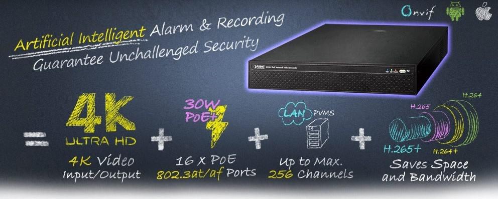 PLANET NVR-2516P es un nuevo grabador de video (NVR) en red PoE integrado Linux de 25 canales con 16 puertos PoE para campus, aeropuertos, transporte y más. Diseñado para aplicaciones de vigilancia IP con pantalla local HDMI; el NVR-2516P admite cámaras IP con hasta 4K y códec de video H265/H264/H265+/H264+ para monitoreo, grabación y reproducción en tiempo real de alta calidad. También es compatible con la resolución de video 4K en cualquier monitor HD.