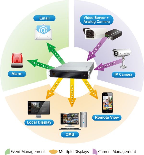 El NVR-E6480 proporciona una capacidad de gestión de vigilancia centralizada con la adopción de su software de gestión central (CMS) incluido. Con el CMS, el sistema NVR se puede expandir para la gestión de múltiples sitios de hasta 64 canales de vigilancia simultáneamente. Además, los usuarios pueden monitorear el NVR a través del visor de la aplicación móvil o el navegador web en cualquier momento y en cualquier lugar.
