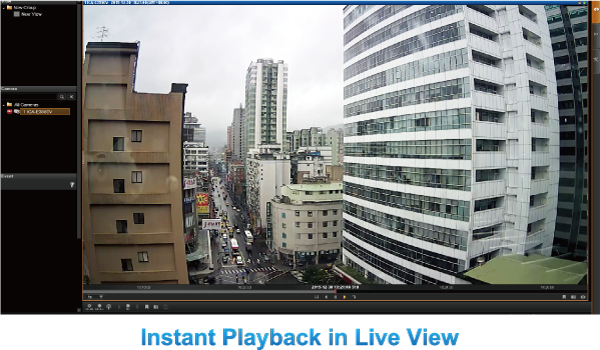 En la página de visualización en directo de la interfaz de gestión del NVR-E6480, siempre que desee volver a comprobar los eventos sospechosos de un canal de cámara que acaba de perder, simplemente pulse el botón "Reproducción instantánea" para abrir la ventana y revisar las transmisiones recientes. Si bien no tiene que cambiar a la página de reproducción para hacerlo, puede tener vistas en directo completas de otros canales simultáneamente.