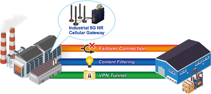 Diseñado con interfaces 5G NR y Gigabit Ethernet WAN, el ICG-2515-NR garantiza la conectividad a Internet al contar con una funcionalidad de conmutación por error entre 5G NR y GbE WAN. El ICG-2515-NR brinda flexibilidad para establecer la prioridad para la conexión 5G NR o GbE WAN. Cuando falla la interfaz WAN principal, la interfaz WAN secundaria respaldará automáticamente la conexión para garantizar una conectividad permanente.