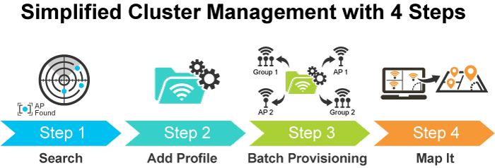 Por ejemplo, para configurar múltiples Smart AP del mismo modelo, el ICG-2515-NR permite agruparlos en un grupo administrado para una administración unificada. Según los requisitos, los puntos de acceso inalámbricos se pueden ampliar o eliminar de un grupo de puntos de acceso inalámbricos en cualquier momento. El clúster de puntos de acceso se beneficia de la provisión masiva y la actualización masiva de firmware a través de un único punto de entrada en lugar de tener que configurar los ajustes en cada uno de ellos por separado.