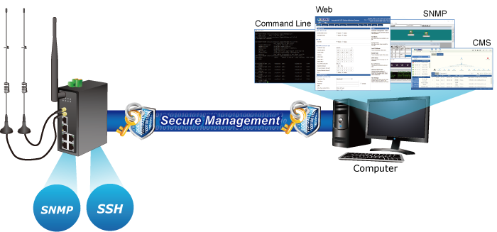 Para una gestión eficiente, el ICG-2510W-LTE está equipado con interfaces de gestión de consola, web, SNMP y CMS (sistema de gestión central). Con la interfaz de gestión basada en web incorporada, el ICG-2510W-LTE ofrece una función de gestión y configuración fácil de usar e independiente de la plataforma. El ICG-2510W-LTE es compatible con SNMP y se puede gestionar a través de cualquier software de gestión basado en el protocolo estándar SNMP v1 o v2c. Además, el ICG-2510W-LTE ofrece una gestión remota segura al admitir una conexión SSH, en la que el contenido de los paquetes se puede cifrar en cada sesión. El CMS puede gestionar varios dispositivos y obtener un estado instantáneo.