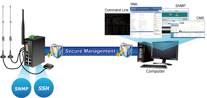 Para una gestión eficiente, el ICG-2510WG-LTE está equipado con interfaces de gestión de consola, web, SNMP y CMS (sistema de gestión central). Con la interfaz de gestión basada en web incorporada, el ICG-2510WG-LTE ofrece una función de gestión y configuración fácil de usar e independiente de la plataforma. El ICG-2510WG-LTE admite SNMP y se puede gestionar a través de cualquier software de gestión basado en el protocolo SNMP v1 o v2 estándar. Además, el ICG-2510WG-LTE ofrece la gestión remota segura al admitir la conexión SSH donde el contenido del paquete se puede cifrar en cada sesión. El CMS puede gestionar varios dispositivos y obtener el estado instantáneo.
