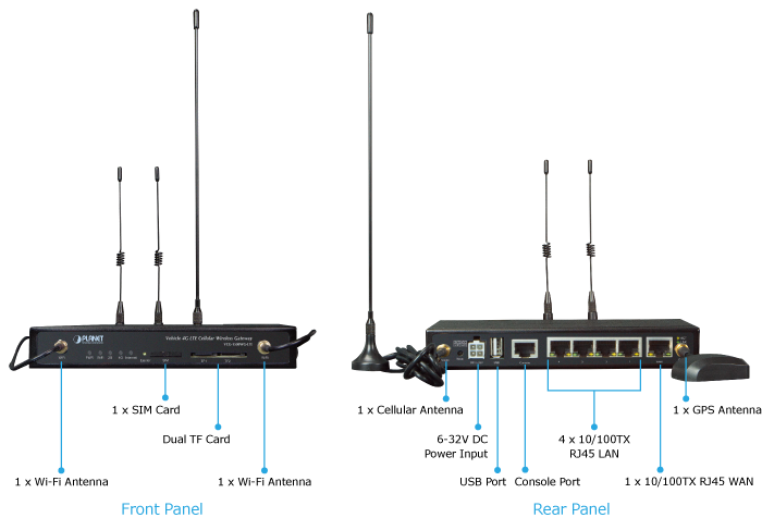 PLANET VCG-1500WG-LTE es una pasarela celular para vehículos de comunicaciones confiable, segura y de alto ancho de banda para aplicaciones móviles exigentes e implementaciones de IoV (Internet de los vehículos). Cuenta con 4G LTE (evolución a largo plazo), punto de acceso inalámbrico, cinco puertos Ethernet (4 LAN y 1 WAN), GPS, tecnología VPN y administración de ancho de banda, todo en una carcasa metálica montable para establecer una conexión de red pública y permite a los pasajeros acceder a Internet.