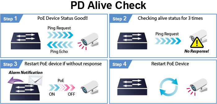 El VR-300PW6 se puede configurar para monitorear el estado del PD conectado en tiempo real a través de una acción de ping. Una vez que el PD deja de funcionar y responder, el VR-300P reanudará la alimentación del puerto PoE y hará que el PD vuelva a funcionar. Mejorará en gran medida la confiabilidad de la red a través del puerto PoE que restablece la fuente de alimentación del PD y reduce la carga de administración del administrador.