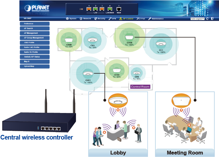 Los VR-300W6 y VR-300PW6 proporcionan una gestión centralizada de la serie PLANET Smart AP a través de una interfaz gráfica de usuario web fácil de usar. Es fácil configurar el punto de acceso para la SSID inalámbrica, la banda de radio y los ajustes de seguridad. Con un proceso de configuración de cuatro pasos, se pueden entregar simultáneamente diferentes propósitos de perfiles inalámbricos a varios puntos de acceso o grupos de puntos de acceso para minimizar el tiempo, el esfuerzo y el coste de implementación.