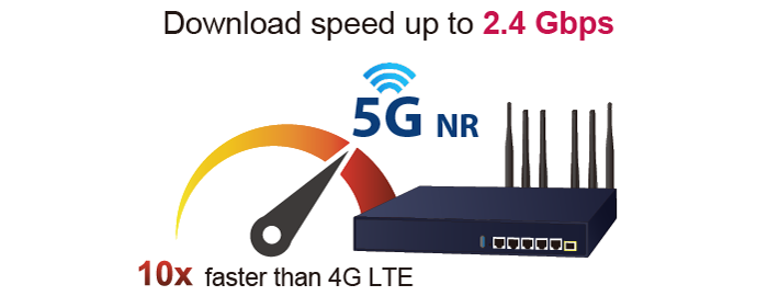 El VR-300FW-NR admite velocidades de descarga (enlace descendente) 5G NR superiores a 2,4 Gbps y velocidades de descarga 4G LTE de hasta 1 Gbps. El ancho de banda de amplio espectro acelera las velocidades de Internet y reduce la latencia de la red para servicios de conectividad premium y sensibles al tiempo. También admite conectividad multibanda, incluidos LTE FDD/TDD, WCDMA y GSM para una amplia gama de aplicaciones.