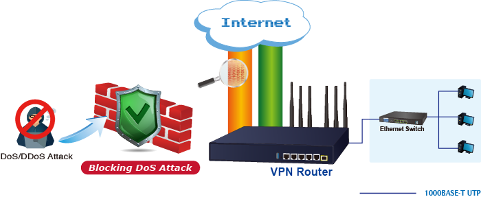El VR-300FW-NR con firewall SPI (inspección de paquetes con estado) incorporado y funciones de mitigación de ataques DoS/DDoS proporciona alta eficiencia y amplia protección para su red. Por lo tanto, las funciones de servidor virtual y DMZ pueden permitirle configurar servidores en la Intranet y seguir brindando servicios a los usuarios de Internet.