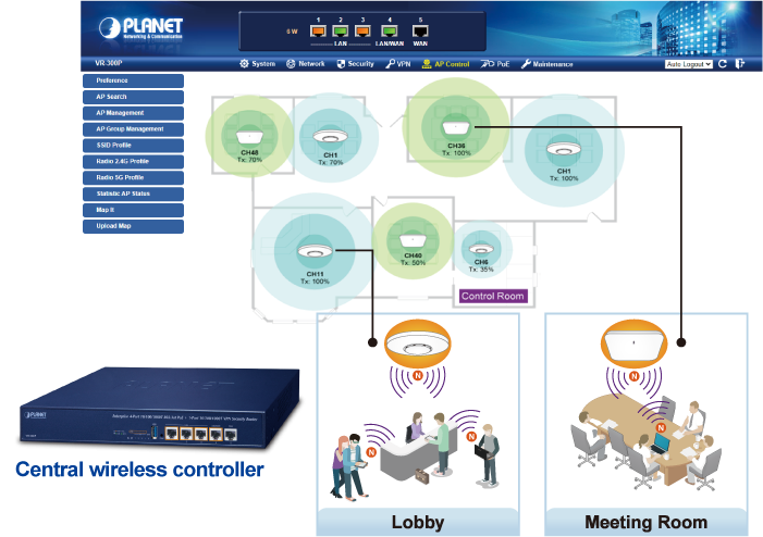 El VR-300F y el VR-300FP proporcionan una administración centralizada de la serie PLANET Smart AP a través de una interfaz gráfica de usuario web fácil de usar. Es fácil configurar el AP para la SSID inalámbrica, la banda de radio y las configuraciones de seguridad. Con un proceso de configuración de cuatro pasos, se pueden entregar simultáneamente diferentes propósitos de perfiles inalámbricos a múltiples AP o grupos de AP para minimizar el tiempo, el esfuerzo y el costo de implementación.