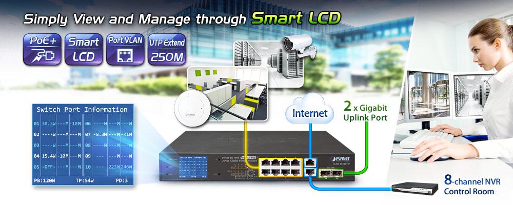Switch de escritorio combinado Gigabit TP/SFP de 8 puertos 10/100TX 802.3at PoE + 2 puertos Gigabit TP/SFP con monitor LCD PoE