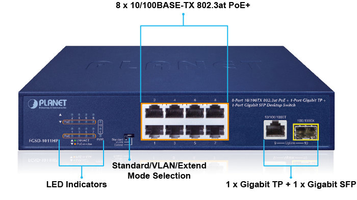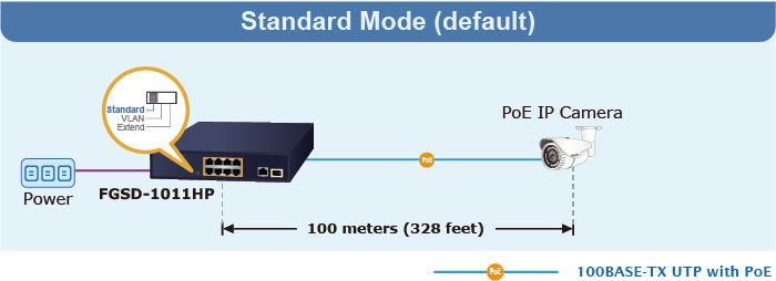 El interruptor DIP sólido incorporado proporciona modos de operación “Estándar”, “VLAN” y “Extendido”. El FGSD-1011HP funciona como un conmutador PoE IEEE 802.3af/at normal en el modo de operación “Estándar”. El modo de operación “VLAN” cuenta con una función VLAN basada en puerto que puede ayudar a evitar que la tormenta de multidifusión o difusión de la cámara IP se influya entre sí.
