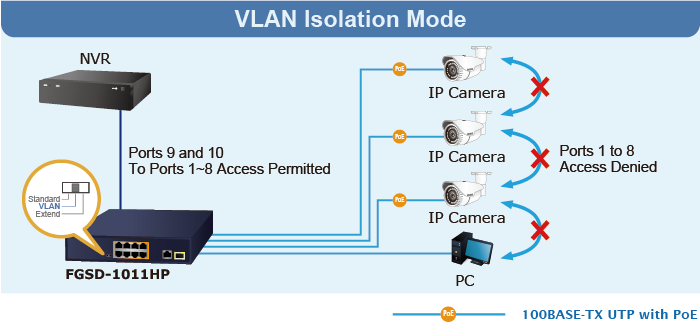 En el modo de operación “Extendido”, el FGSD-1011HP funciona por puerto a una velocidad de funcionamiento dúplex de 10 Mbps, pero puede admitir una salida de energía PoE de 30 vatios a una distancia de hasta 250 metros, superando el límite de 100 m del cable UTP Ethernet. Con esta nueva característica, el FGSD-1011HP proporciona una solución adicional para la extensión de la distancia PoE 802.3af/at, ahorrando así el costo de la instalación del cable Ethernet. Su función de aislamiento VLAN aísla cada puerto para evitar tormentas de transmisión y defenderse de la suplantación de DHCP en el modo de operación "Extender".