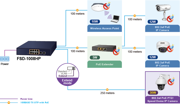 • En el modo de funcionamiento "Extend", el FSD-1008HP funciona por puerto a una velocidad de funcionamiento dúplex de 10 Mbps, pero admite una salida de potencia PoE de 30 vatios a una distancia de hasta 250 metros, superando el límite de 100 m del cable UTP Ethernet.