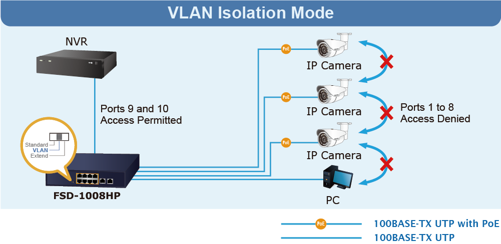 Con esta nueva función, el FSD-1008HP proporciona una solución adicional para la extensión de distancia PoE+ 802.3at, ahorrando así el coste de la instalación del cable Ethernet.
