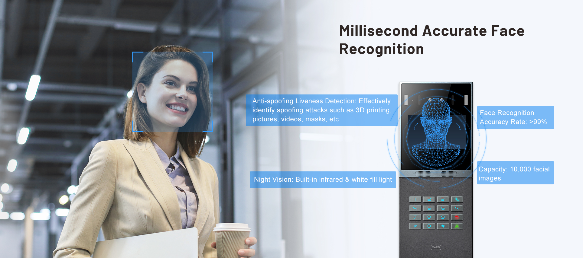 Además, admite la comunicación de audio y video con teléfonos IP, estaciones interiores o a través de una aplicación móvil. Con múltiples métodos de apertura de puertas, es ampliamente aplicable en escenarios de edificios comunitarios, de apartamentos y de oficinas.